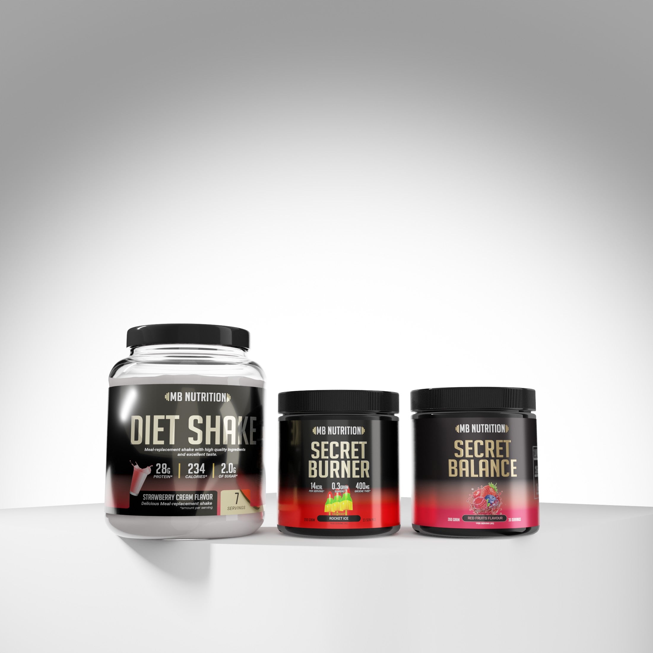 Deze bundel van MB Nutrition bevat Secret balance, Secret Burner (200gr) en Diet Shake – ideaal als aanvulling op een gebalanceerd voedings- en trainingsplan.